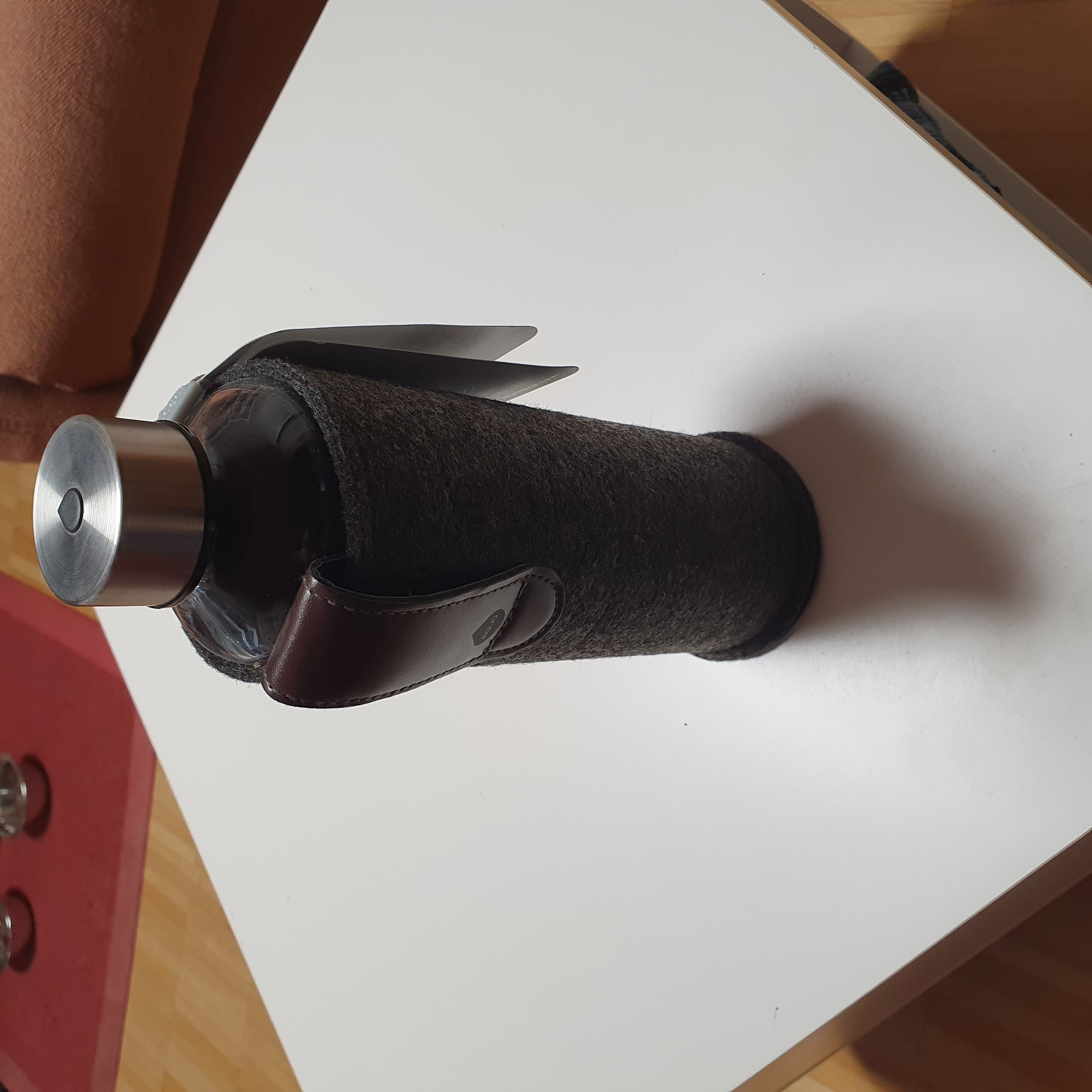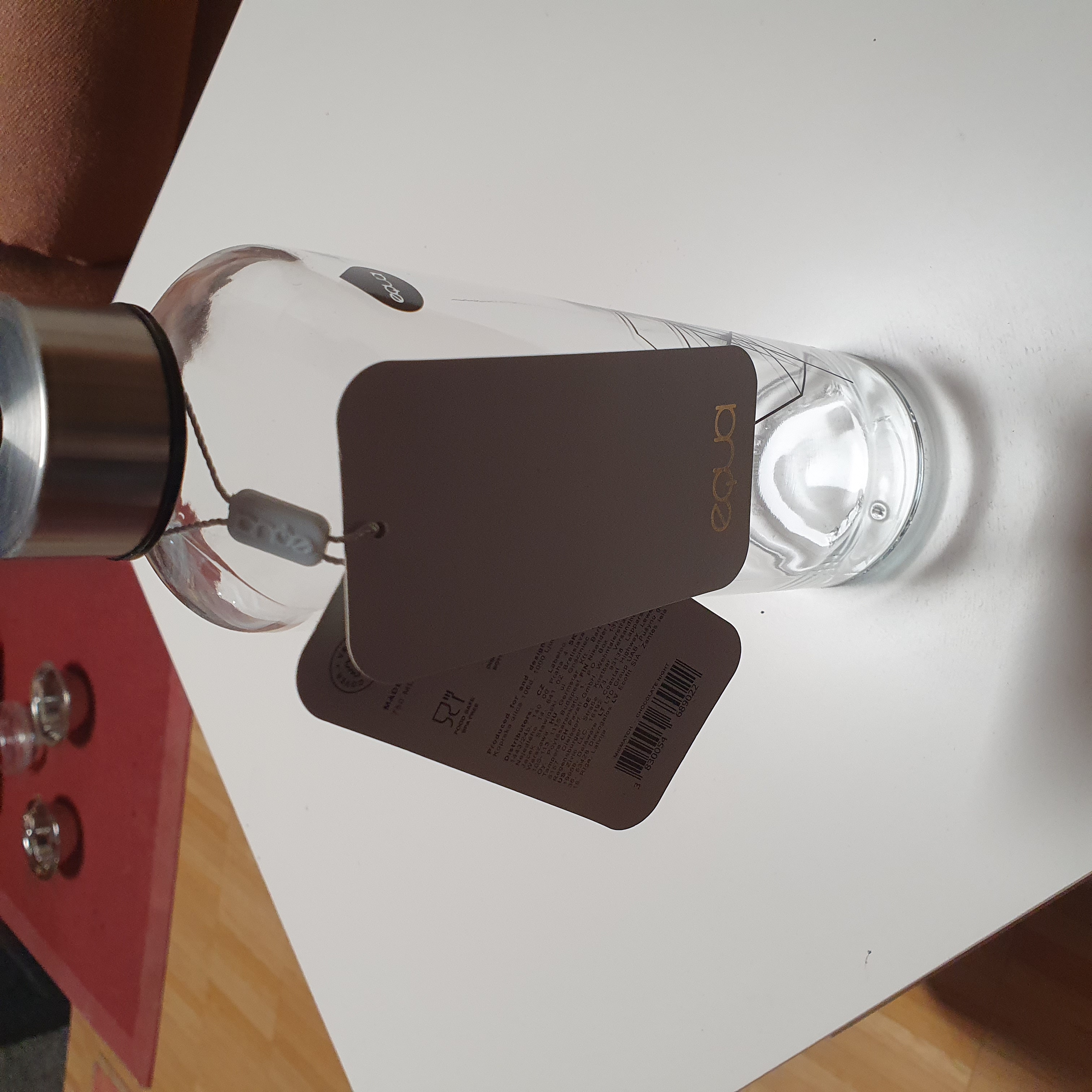 Neuwertige, unbenutzte equa-Glastrinkflasche mit Filzhülle